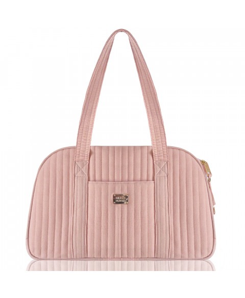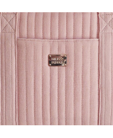Closed carry bag in powder pink quilted gauze cotton and powder pink meshPowder pink cotton gauze liningSmall removable cushion in powder pink gauze cottonPowder pink gauze cotton lead - Golden metal snap hookGolden metal plate "Milk&PepperPowder pink quilted gauze cotton shoulder strapSmall golden metal bag feetLarge zipped front pocketMax weight 6kg and 7KgSize: 40x25x25(h)