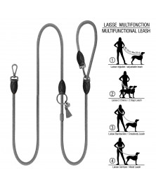 Adjustable size from 125 to 220cm - Diameter: 9mm / Adjustable size from 125 to 220cm - Diameter: 12mmMultifunctional leash in charcoal grey braided polyester and black leatheretteTitanium finish buckleCharcoal grey threads tassel and titanium tip4 possible positions (adjustable length leash / Shoulder strap position / Belt position / 2 dogs leash)
