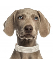 )Adjustable collar in braided beige polyester and vintage camel simili leatherTitanium buckles