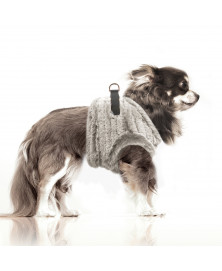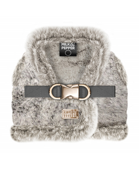 Harness for small and middle-sized dogsIn natural/ taupe very soft fantasy furLining and bordering in natural /taupe very soft fantasy furGolden clip and buckle Grey nylon strapSmall golden "Milk&Pepper" plate at the top of the backClosed with a strong scratch tape