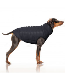 Reversible winter jacket for small and middle-sized dogsIn quilted polyester (with water repellent treatment)Available in Yellow/Grey or in Red/Kaki or in Pink/NavyCollar with a black bindingOff-white felt and gum sticker on both sideZipped hole for the leash on the backClosing under the belly with adjustable scratch tapesElastic for the tail