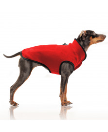 Fleece jacket for small and middle-sized dogsBlack bindingOff-white felt and sticker on the bottom of the backZipped hole for the leash on the backClosing under the belly with adjustable scratch tapeElastic for the tail Available in Red, Pink, Grey and Yellow