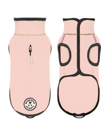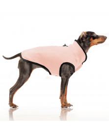 Fleece jacket for small and middle-sized dogsBlack bindingOff-white felt and sticker on the bottom of the backZipped hole for the leash on the backClosing under the belly with adjustable scratch tapeElastic for the tail Available in Red, Pink, Grey and Yellow