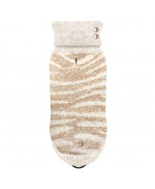 Sweater for small/middle-sized dogsStriped sweater in mottled black jacquar and Titanium colour thread or in in mottled beige/taupe jacquar with golden threads Small Titanium or golden colour "Milk&Pepper" plate on the bottom of the back2 small Titanium or Golden colour buttons on the collarLeash hole on the collarEasy leg passageElastic for the tail