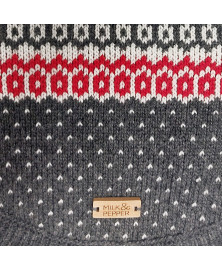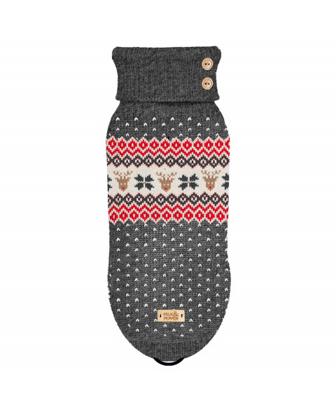Norwegian sweater for small/middle-sized dogs + bulldogs (L sizes)Anthracite grey/red/off-white and taupe jacquard sweater (snowflake and reindeer head designs)Reindeer head in off-white/taupe Jacquard weaved with red and black sequinsSmall wood "Milk&Pepper" plate on the bottom of the bak2 small wood buttons on the collarLeash hole on the collarEasy leg passageElastic for the tail
