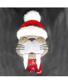 Anthracite grey velvet sweater for small and middle-sized dogsApplied camel/off-white walrus headBlack (nose) and red (cap and scarf) sequinsOff-white fantasy fur pom-pom on the capSmall Titanium colour metal "Milk&Pepper" plate on the bottom of the back
