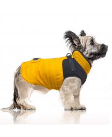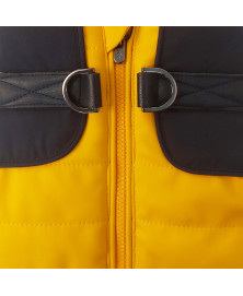 Harness coat in yellow coated waterproof material (like "Babord" raincoat material) Strong navy twill polyester yoke and collar bindingOff-white/Navy interlock liningZipped opening all throught the backNavy leather-like fixing lug and Titanium colour metal buckles for the leash"Yachting" navy/off-white wooven sticker