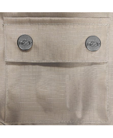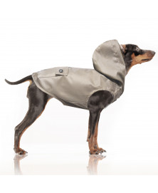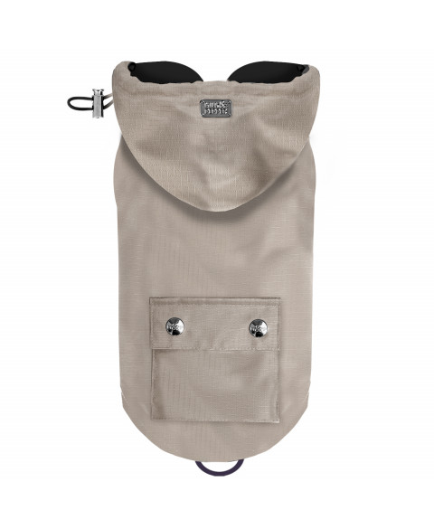 Ripstop raincoat in beige/taupe colour (100% waterproof)Black interlock liningRemovable hoodPocket with snaps on the backSmall Titanium colour metal "Milk&Pepper" plate on the hoodClosing under the belly with Titanium colour snaps engraved "M&P"Titanium colour metal stopper on the hoodElastic for the tail