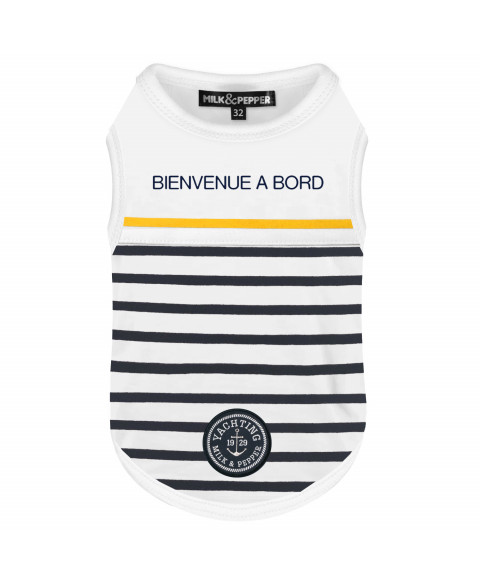 Middle-sized/small dogs tee-shirt + french bulldogs + DachshundNavy/off-white sailor T-shirtOne yellow printed stripe and navy printing "Bienvenue à Bord"Navy/off-white/titanium colour "Yachting" woven patch
