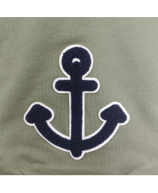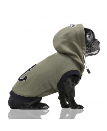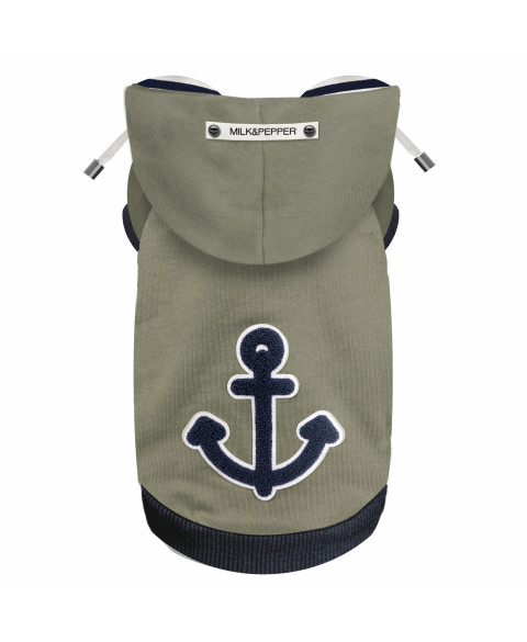 For middle-sized/small dogs + french BulldogsSleevless Kaki/Navy "French Terry" sweaterHood lined with striped navy/Off white interlock liningLeash hole on top of the backClosing under the belly with titanium colour metal snaps engraved "M&P"Navy felt anchor and off-white Chenille Embrodery on the backOff-white strap with titan-colour small buttons - navy "Milk&Pepper" Printing
