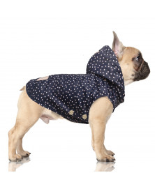 Sleeveless Raincoat with removable hoodWaterproof navy material with pink dots (exclusive printing)Lined with pink Jersey InterlockClosing under the belly with golden colour metal snaps engraved "M&P"single snap raw from 26 to 32 sizesDoubled snap raw from 35 to 45 sizePink woven sticker "Yachting Milk&Pepper"Small golden colour "Milk&Pepper" plate on the hoodPink little tassel on the end of the HoodGolden colour metal Stopper on the HoodElastic for the tailLeash hole on top of the back