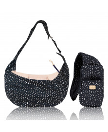 Navy/pink spots gabardine adjustable shoulder bagLining in powdered pink InterlockSide-pocket with golden colour metal plateInner small leash in navy cord and golden colour hookSmall : 52x19(h) Big : 55x21,5(h)