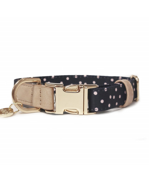 )Navy/pink printed adjustable polyester collar with taupe vintage leather-like finishingGolden colour metal buckles (Clip/D-Ring)Golden colour metal medal engraved "M&P"
