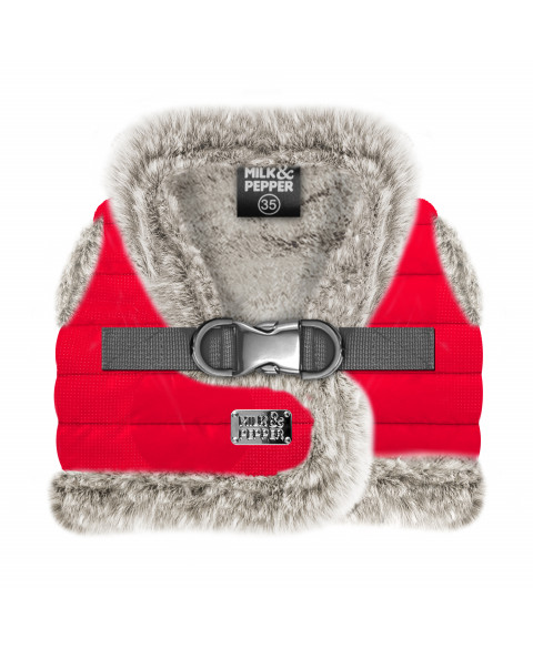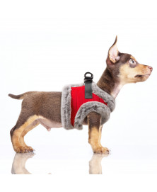 Harnais « doudoune » en nylon matelassé rouge avec surimpression micro-pois ton sur ton (traité déperlant ) créé spécialement pour les petits chiens et les chiens moyens