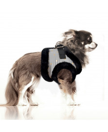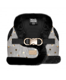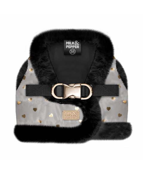 • Harnais en nylon gris perle avec impression « cœurs dorés » (traité déperlant) créé spécialement pour les petits chiens et les chiens moyens