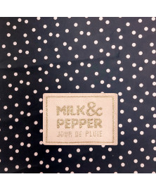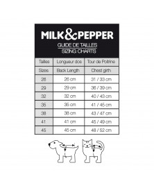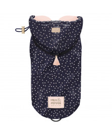 Imperméable à capuche amovible / sans manches Matière waterproof fond marine à pois roses (imprimé exclusif) capuche doublée en jersey bleu rose Ouverture sur la partie ventrale avec pressions en métal dorées Simple rangée de pression de la taille 26 à 32 Double rangée de pression de la taille 35 à 45 Etiquette tissé rose et lurex doré en bas du dos Petite plaque dorée "Milk&Pepper" sur la capuche Petite pampille Rose au bout de la capuche Stopper capuche en métal doré gravés «M&P» Élastique pour le passage de la queue Ouverture pour le passage de la laisse en haut du dos